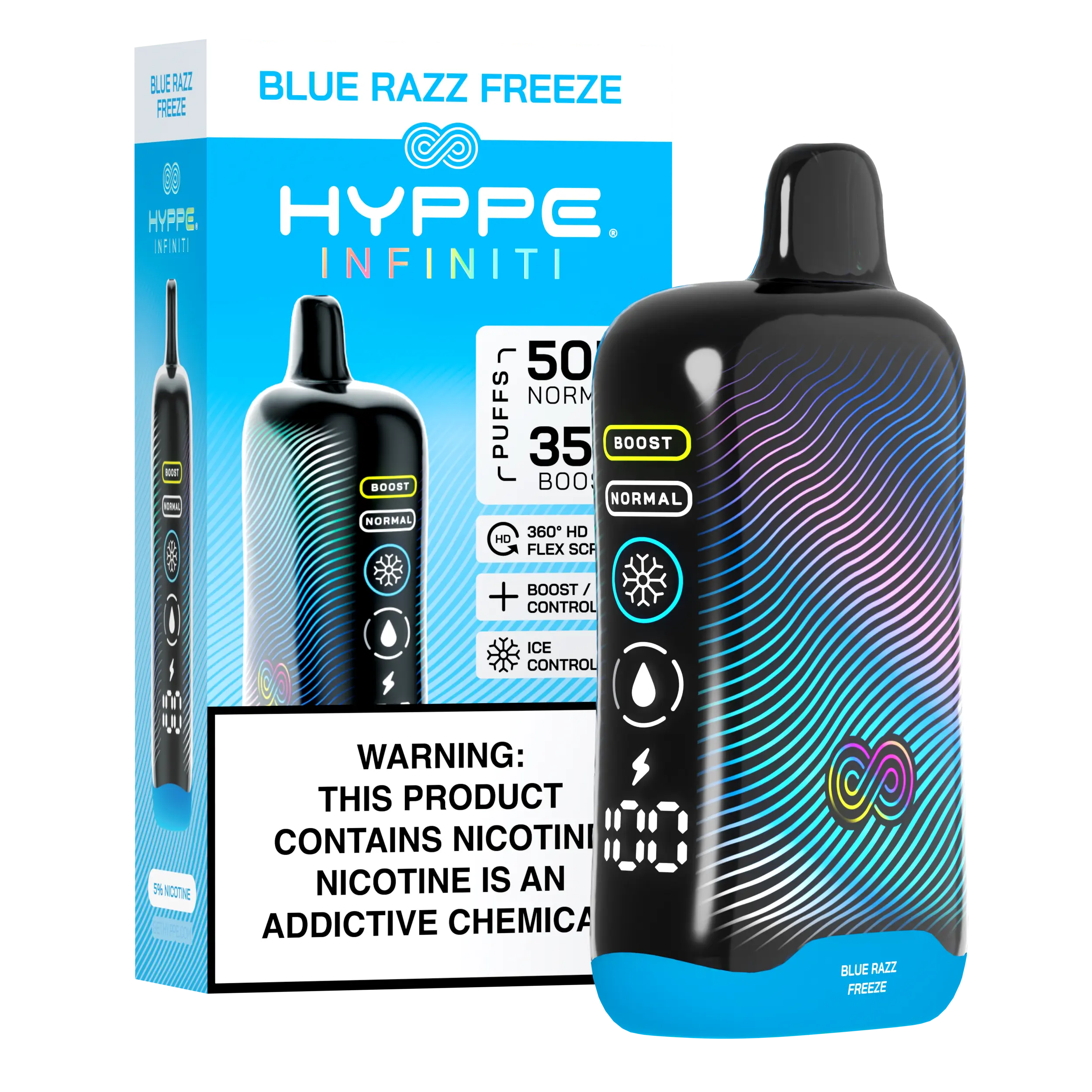 Flavor: The Blue Razz Freeze Hyppe Infiniti 50K delivers the quintessential flavor of sweet and tangy blue raspberry slushy, finished with a powerful, icy menthol freeze. This intensely cooling and flavorful vape provides up to 50,000 puffs of refreshing satisfaction.