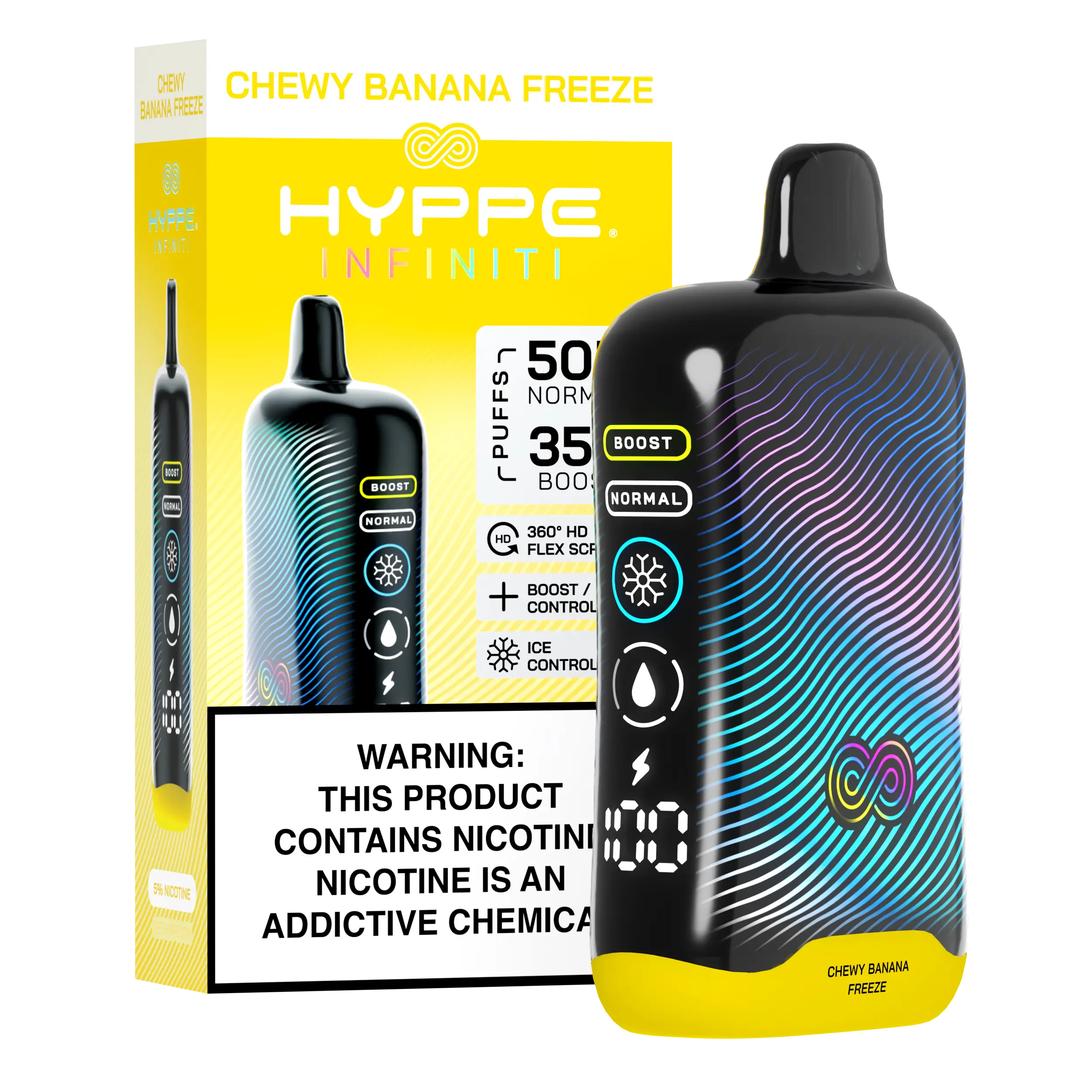 Flavor: The Chewy Banana Freeze Hyppe Infiniti 50K offers a unique profile combining the rich, sweet flavor of artificial banana candy (like taffy or chewy sweets) with a refreshing, icy menthol freeze. This nostalgic, cool flavor lasts for an amazing 50,000 puffs.