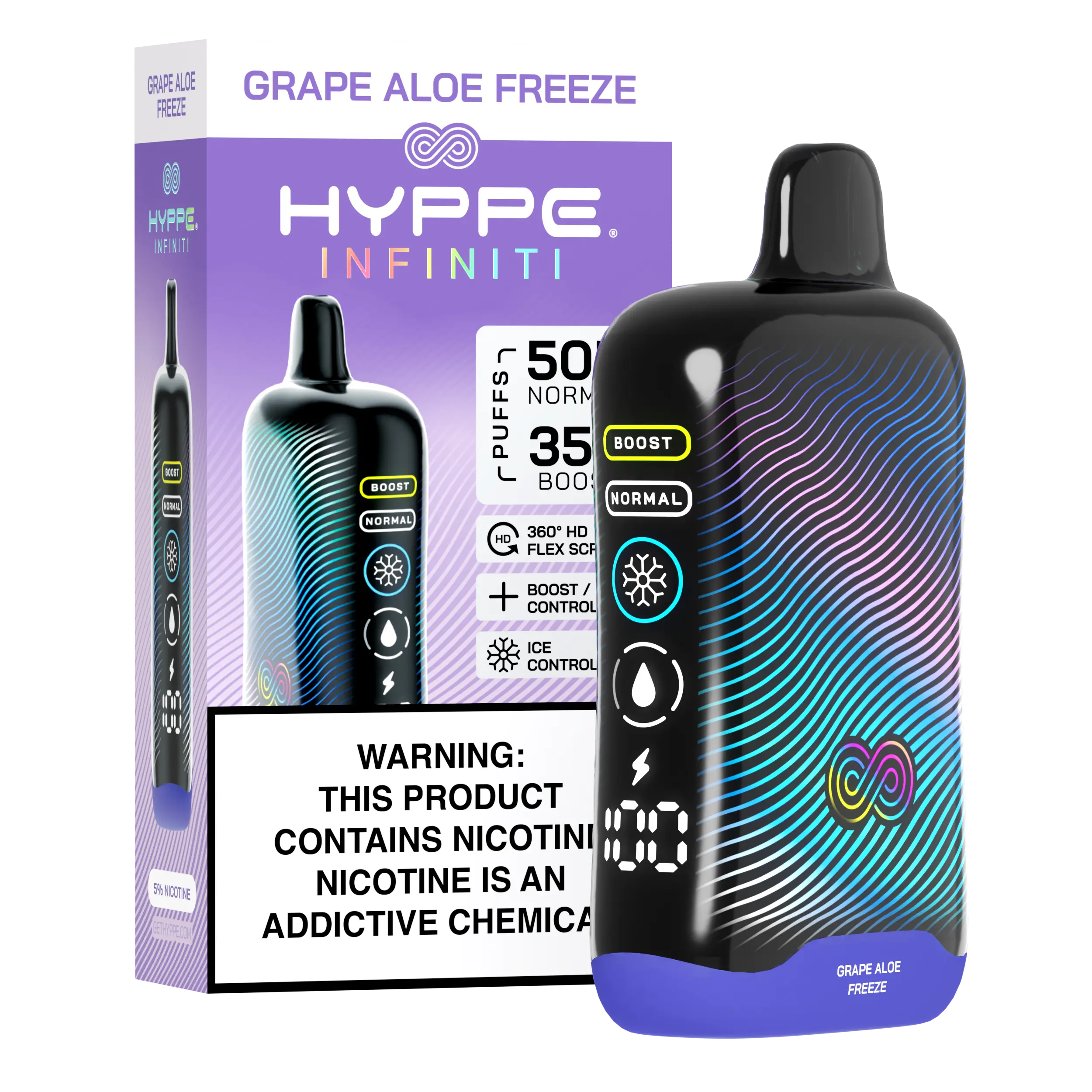 Flavor: The Grape Aloe Freeze Hyppe Infiniti 50K is a smooth, hydrating flavor that combines sweet, rich purple grape with the subtle, soothing notes of aloe vera, all locked in with a crisp menthol freeze. Enjoy this distinctive and long-lasting flavor for up to 50,000 puffs.