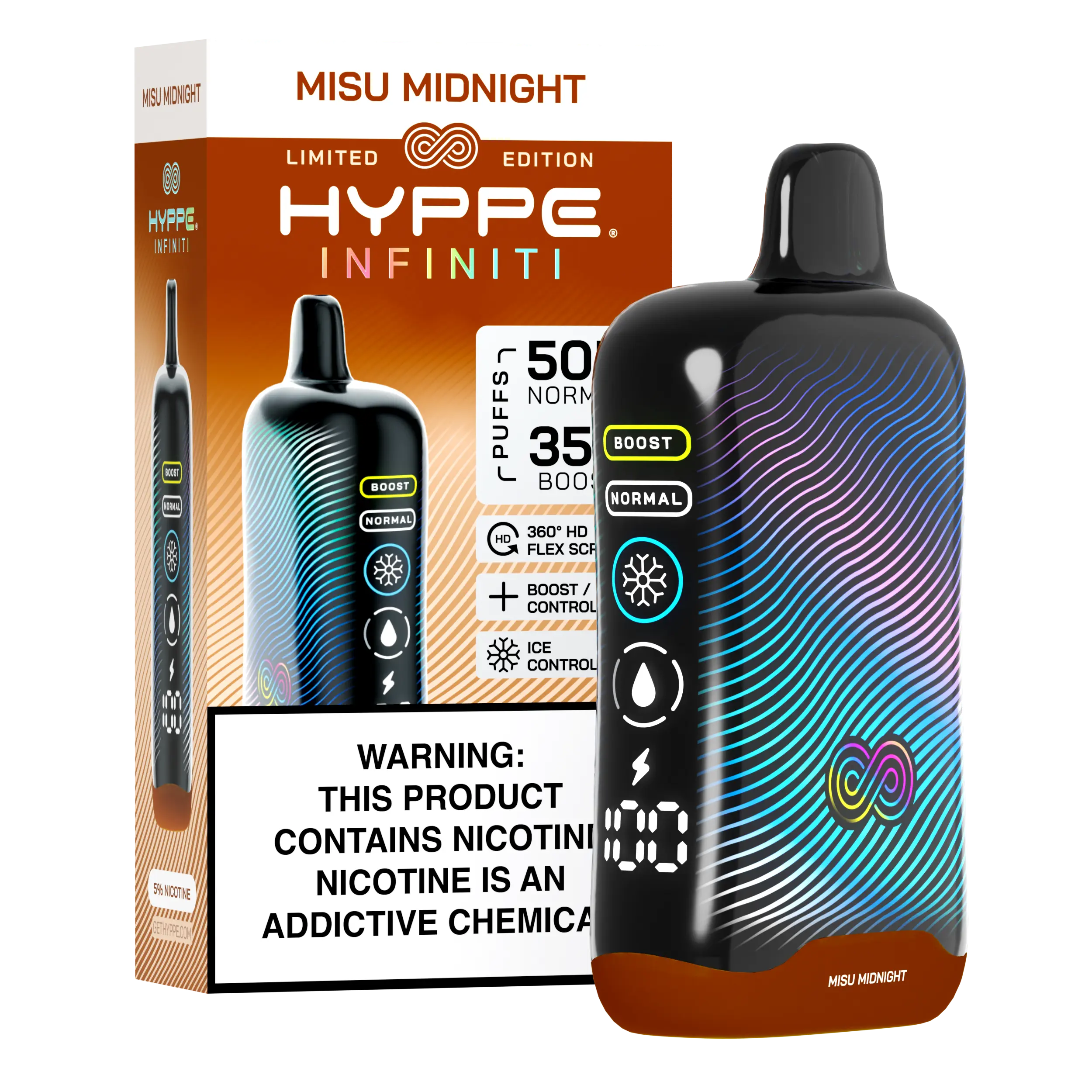 Hyppe Infiniti 50K Disposable VapeStep into the future of disposable vaping with the Hyppe Infiniti 50K โ a powerhouse device engineered for longevity, flavor, and full control. With cutting-edge features and a performance-driven design, it redefines what a high-capacity disposable can do. This premium device offers up to 50,000 puffs in Normal Mode, or switch to Boost Mode for a more intense experience with up to 35,000 puffs. The wraparound 360ยฐ display screen keeps you informed with real-time battery, e-liquid, and ice-level data. Plus, the adjustable Ice Control lets you customize the cooling sensation to match your preference.