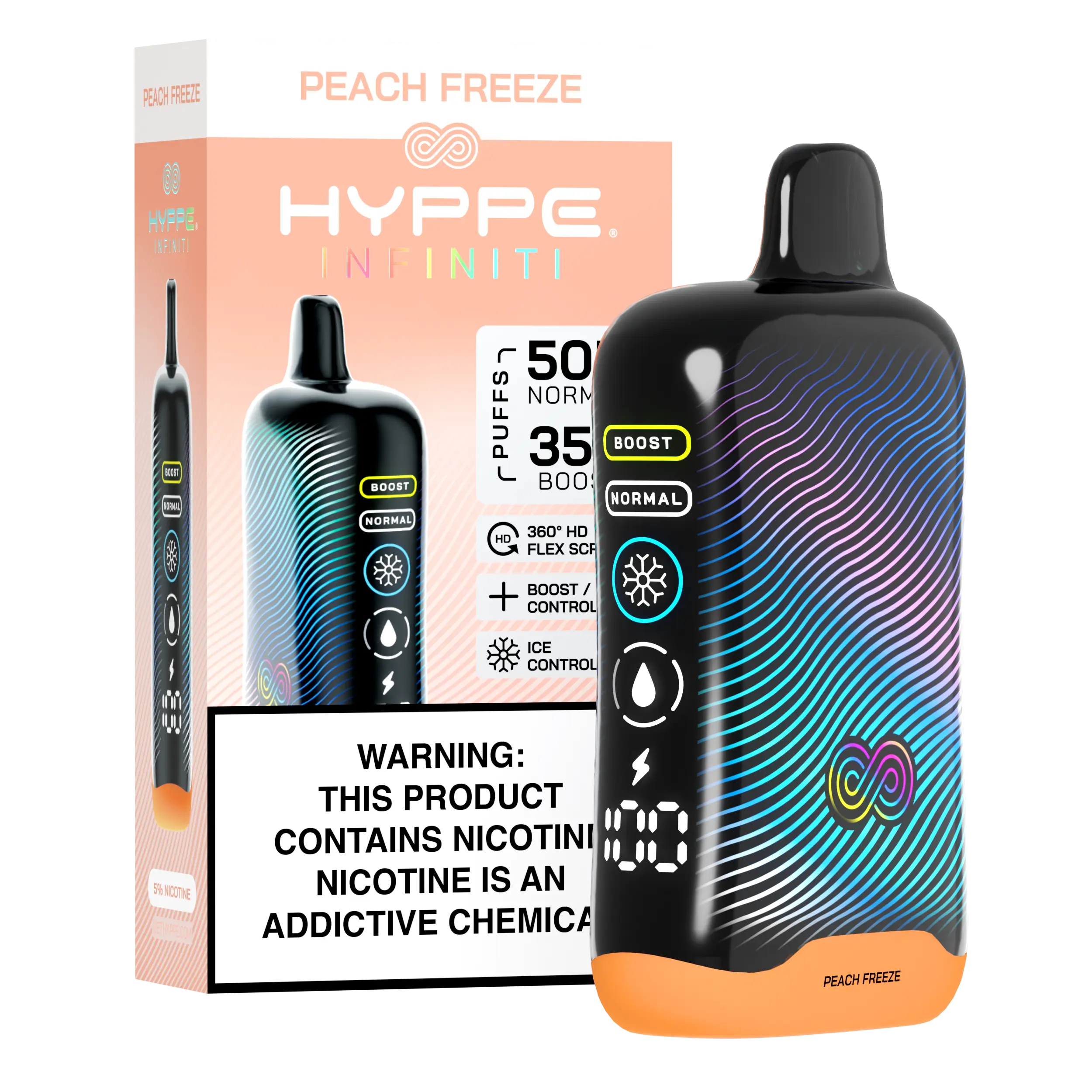Flavor: The Peach Freeze Hyppe Infiniti 50K delivers the delicious taste of sweet, sun-ripened peaches followed by an exhilarating blast of icy menthol. This perfect fusion of fruit and frost provides a refreshing experience that lasts for an amazing 50,000 puffs.
