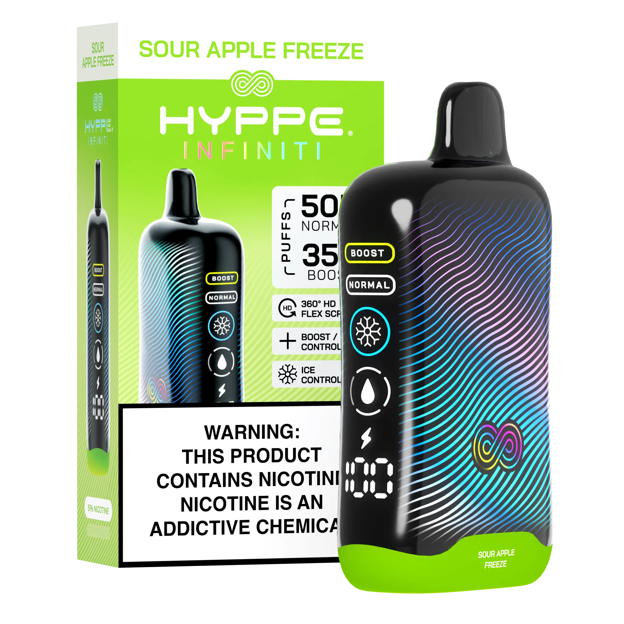 Flavor: The Sour Apple Freeze Hyppe Infiniti 50K is a powerful blend featuring the extreme tartness of crisp green apple candy on the inhale, immediately followed by an intense, refreshing menthol “freeze” on the exhale. This invigorating and long-lasting flavor provides up to 50,000 puffs.