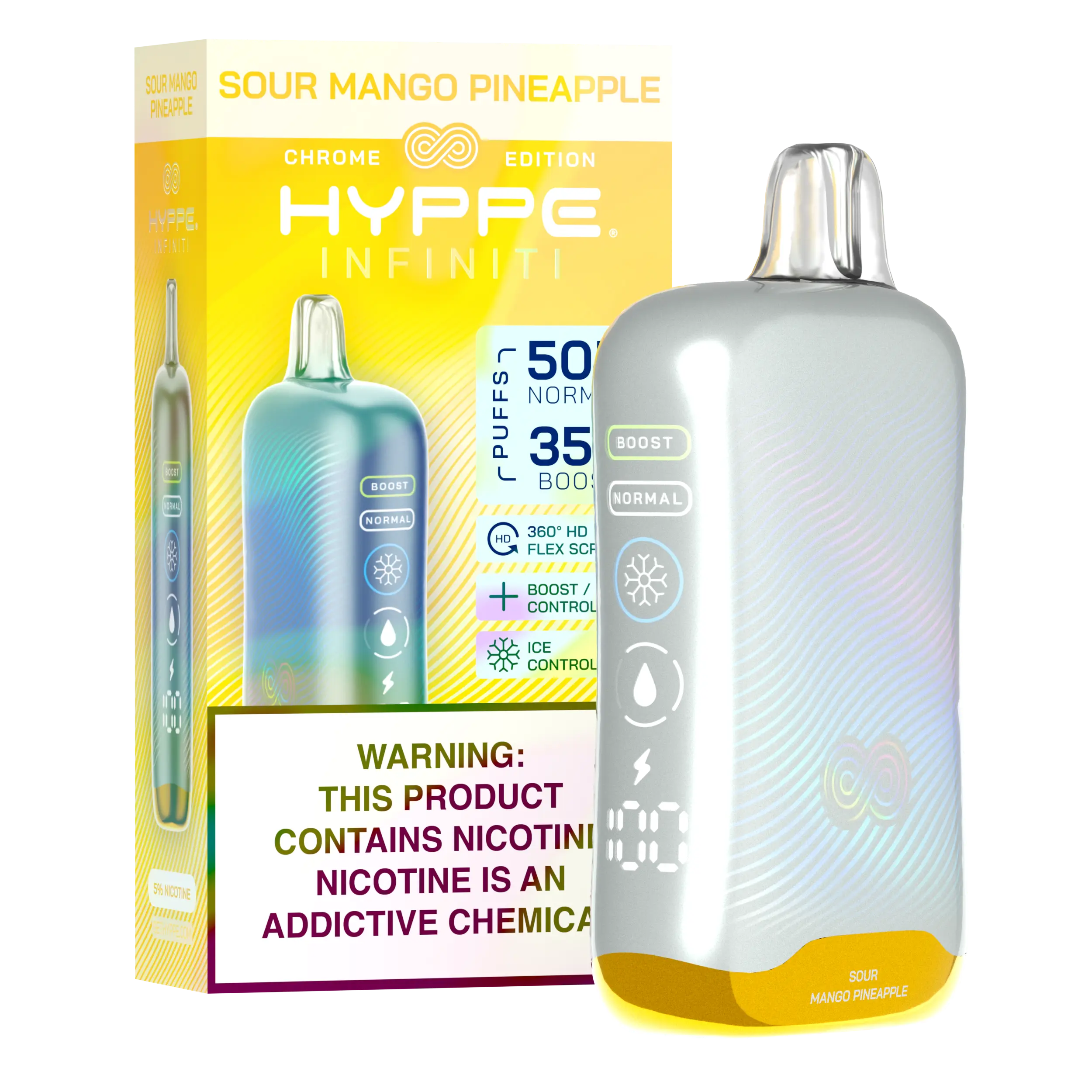 Flavor: The Sour Mango Pineapple Hyppe Infiniti 50K is an electrifying tropical blend. It delivers the luscious sweetness of ripe mango, the sharp zest of pineapple, and an unforgettable, intense sour candy finish. Experience bold flavor for up to 50,000 puffs.