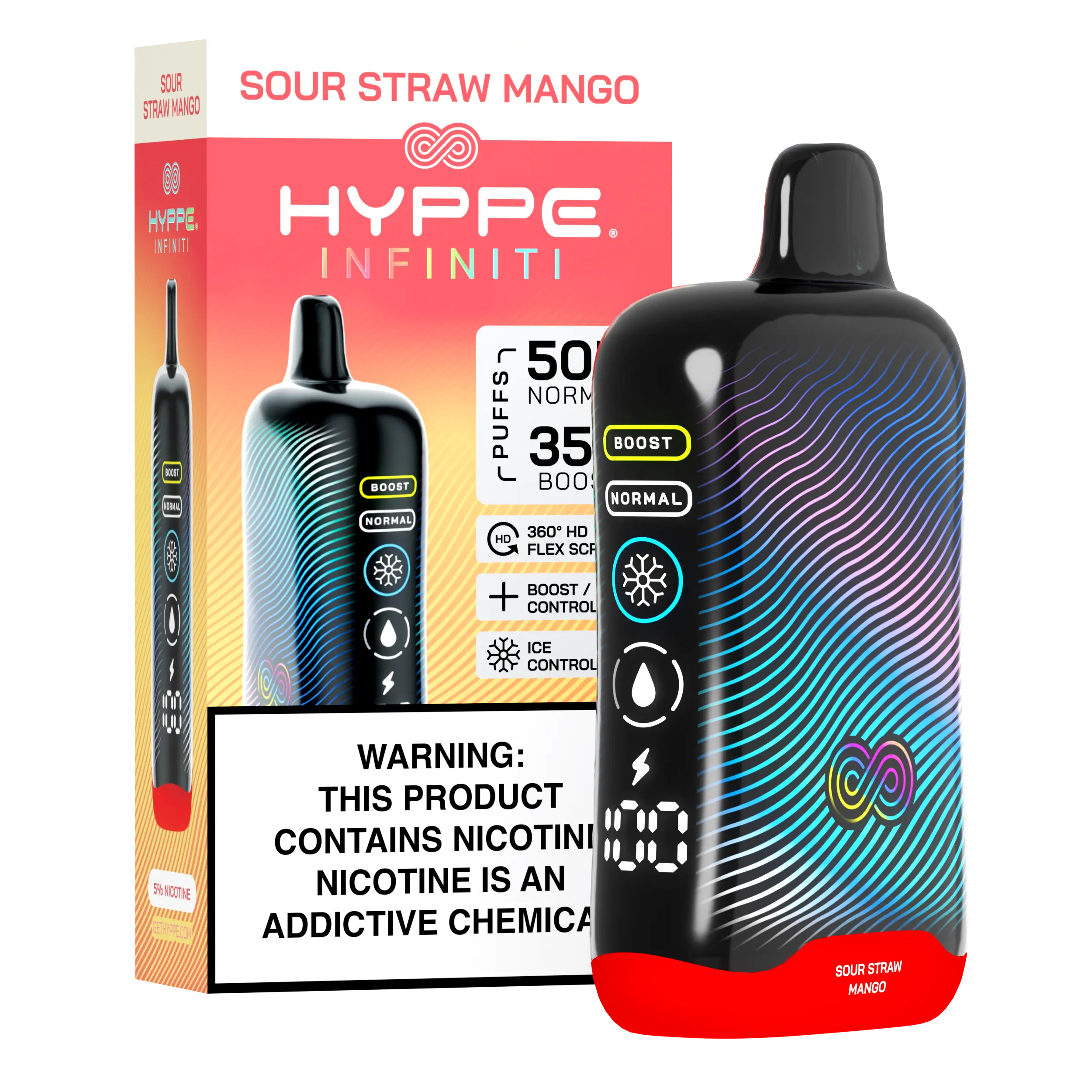 Flavor: The Sour Straw Mango Hyppe Infiniti 50K delivers a delicious twist on tropical fruit. It combines the lush, juicy sweetness of ripe mango with the tangy, mouth-puckering coating of a sour straw candy. This exciting sweet-and-sour flavor lasts for an incredible 50,000 puffs.
