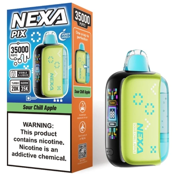 Flavor: The Sour Chill Apple Nexa Pix 35K delivers a crisp green apple flavor with a tangy sour twist and a cool icy finish for a refreshing vape. This rechargeable disposable offers up to 35,000 puffs with mesh coil technology, USB-C charging, and a smart display for real-time performance tracking